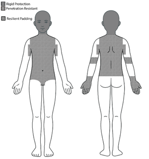 Your torso, including the abdomen down to and including the groin in front, and the inner arm down to 4 inches (10 cm) below the armpit, are to be covered by penetration resistant material.